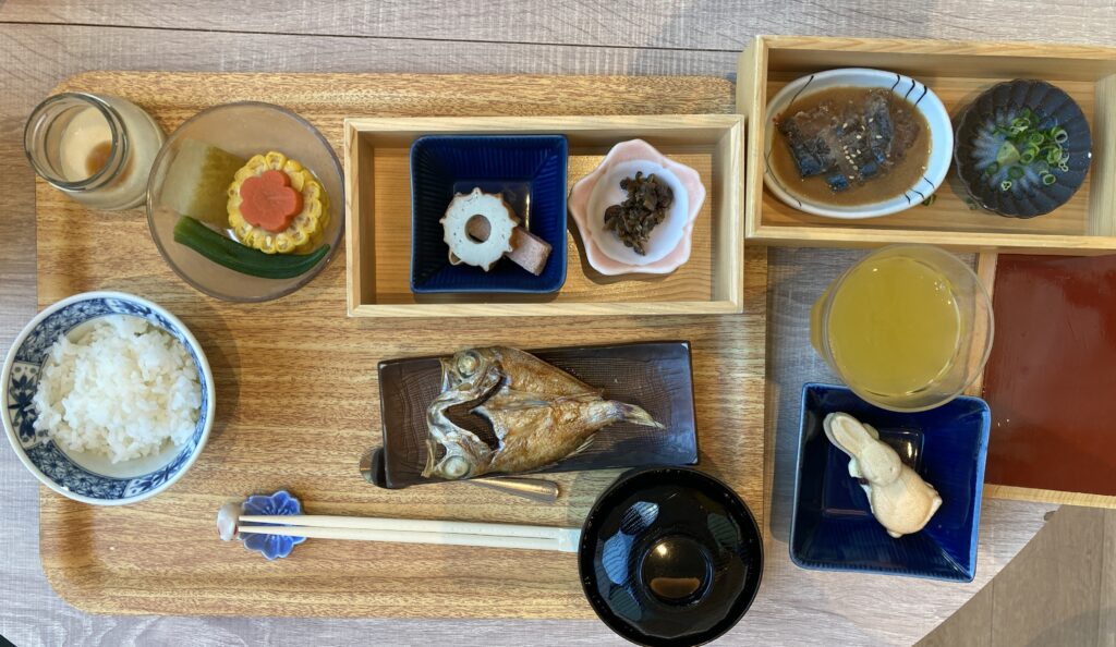 朝食は和食です。 おつゆは宍道湖のシジミ汁です。 デザートのうさぎ最中もいただきます。