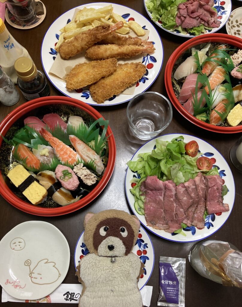 ぽんちゃんのリクエストメニュー(お寿司・ローストビーフ・フライ盛り合わせ)です。