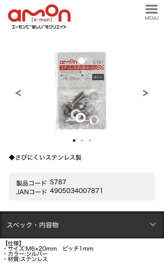 取付ボルト&ナットセットは、エーモン製 M6×20mm